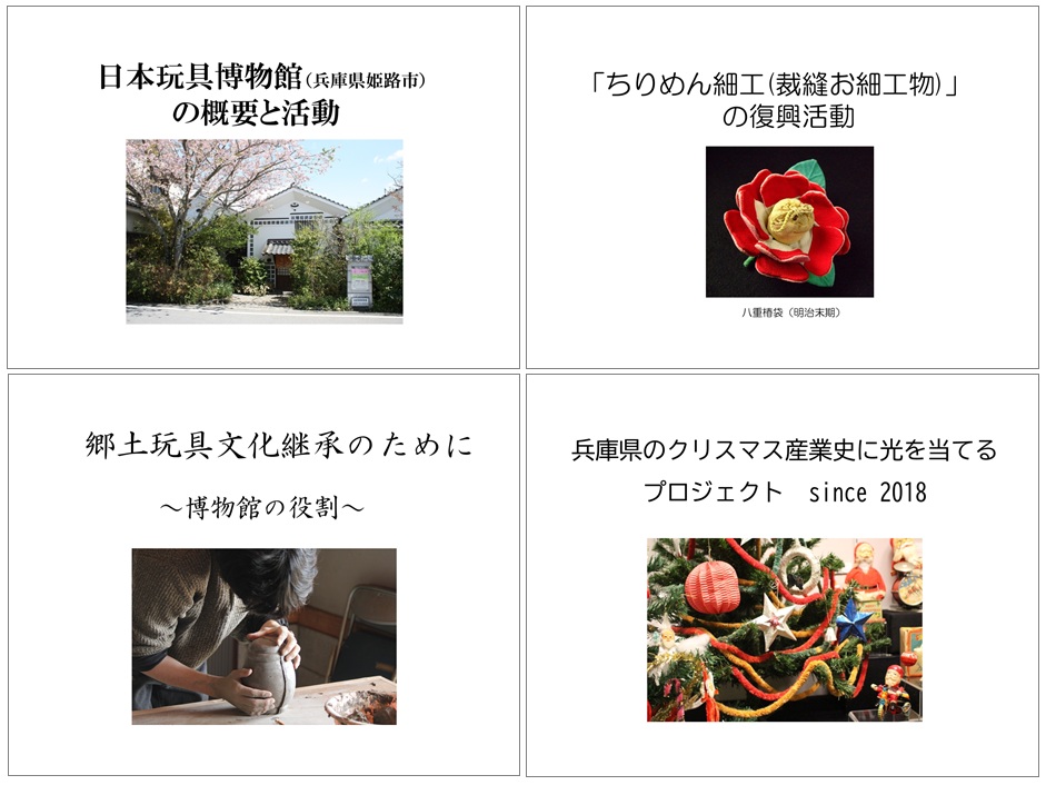 ●3日目の実習要点は、玩具文化を継承していくために当館が行ってきた活動の事例について話を聴き、文化継承における博物館の役割について考えていただくというもの。次に「兵庫県のクリスマス産業史に光を当てる」取り組みについてあらましを理解いただいたうえで、兵庫県周辺で作られていた昭和20~30年代のオーナメントをクリスマスツリーにつるしてランプの家に展示するというものでした。