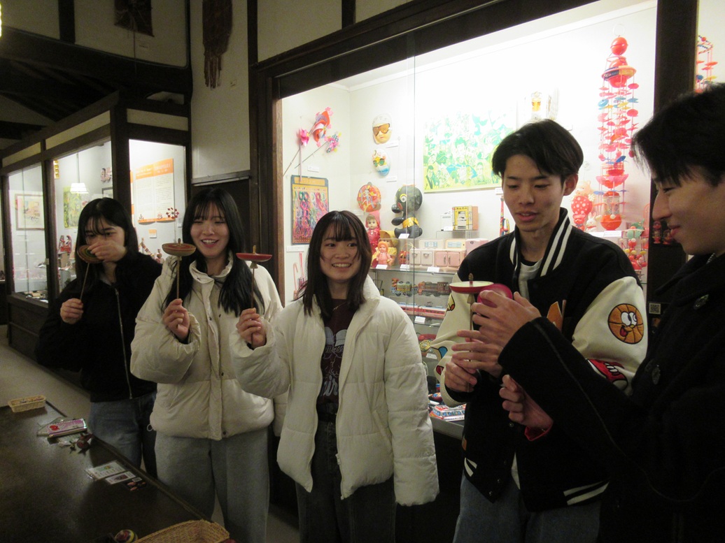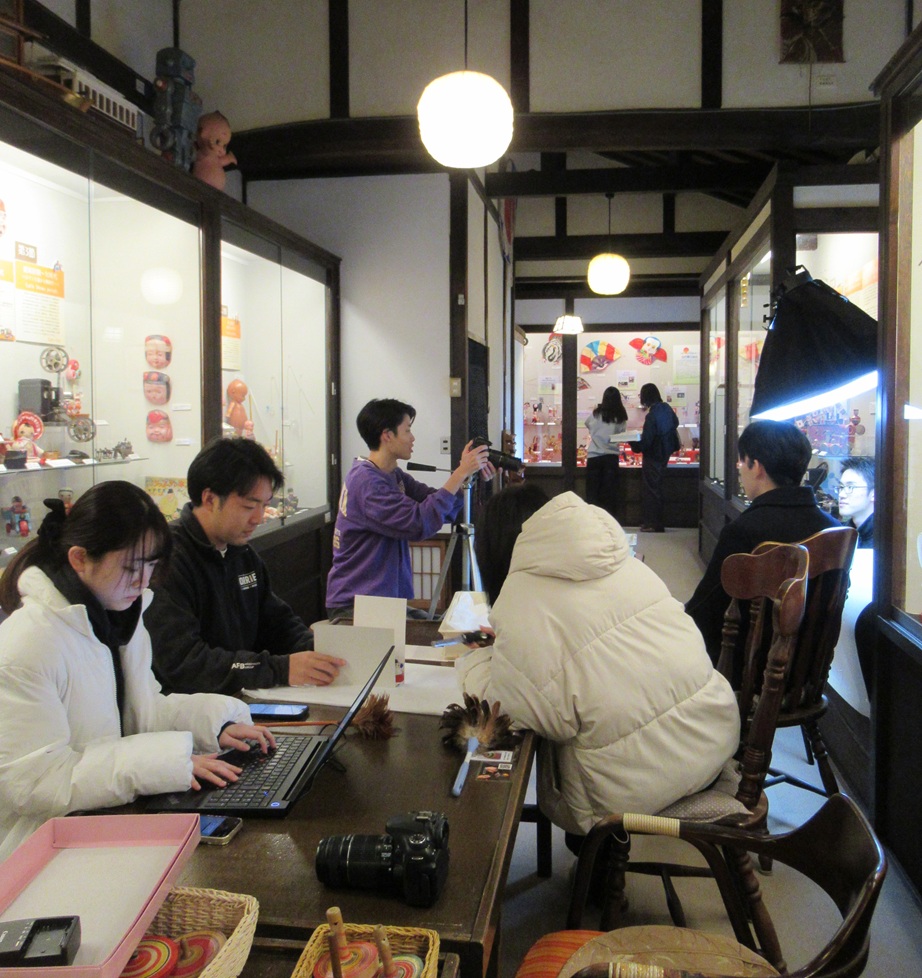 ●12月9日から13日まで、当館では、今年も「地域実習」のために姫路を訪問された青山学院大学のコミュニティ人間科学部の学生さんたちをお預りしておりました。地域づくりの手法を学ぶ学科課程の一環で、当館においては、付き添ってこられた大木真徳先生から指導を受けながら、博物館の成り立ちや館長&スタッフの話を聴いたり、日ごろの博物館活動を体験したり、また当館における玩具文化継承の取り組みについて意見交換を行いながら4日間を過ごしていただき、5日目には姫路の文化施設見学に出かけました。