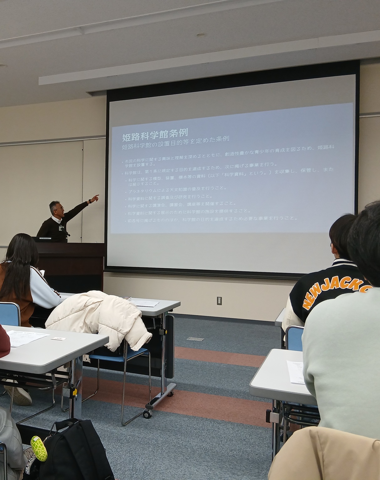 ●4日目には、当館館長と学芸員へのロングインタビューがあり、また、姫路市の様々な部署が取り組まれている教育施策を連携し調整する役割におられる職員の方々と接するひとときがありました。5日目には、城下町姫路の野里地区で町家とその町家文化の再生に取り組むご夫妻を訪ね、お話を聴かせていただきました。さらに姫路科学館では学芸職員から館の歩みやミッションなどについてご案内を受けたり、筆者がちょうど同館友の会から講座の依頼を受けていたこともあり、その活動を見学する機会もあって、――教育や生活文化に関わる仕事に従事する「ひと」の思いと直に触れあっていただけたのではないかと思います。短期間の実習ではありましたが、「生き方や暮らし方、人生における仕事の価値について見直し、考えるようになった」と、それぞれの言葉で感想を残し、充実した表情とともに帰郷された若い人たちの様子を嬉しく思ったことでした。