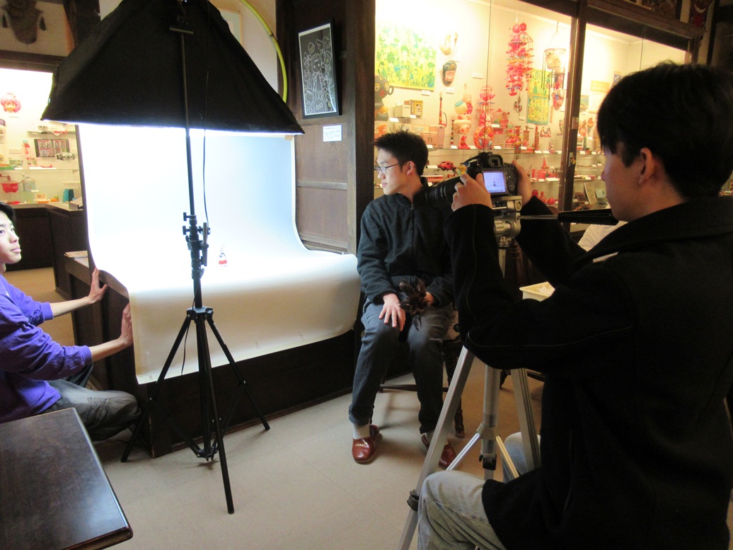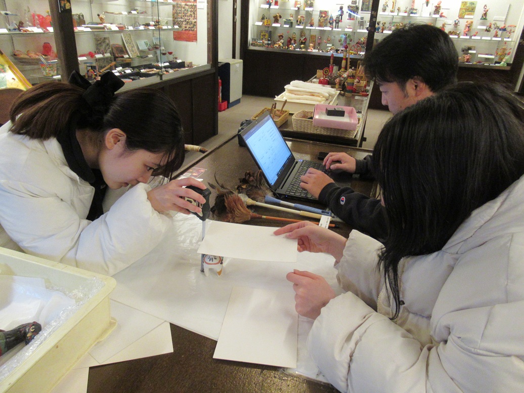 ●実習2日目は休館日に当たっていたため、2号館に撮影機材を広げ、テーマ展「馬の郷土玩具」の展示品目録をつくる作業に取り組んでいただきました。150点ほどの品々を一点一点、展示ケースから取り出し、様々な角度から撮影、採寸、目録作成、また展示し直す――という流れを丁寧に一日かけて。各地の郷土玩具の姿――重さ、匂い、温度などにも――直に触れ、また博物館の地道な作業について体験いただく機会にもなったかと思いますが、「展示品を手にとる」ということで、初めは緊張しておられた皆さんでしたが、慣れてくるにつれ、8人が協力し合い、品々のもつ特徴を味わいつつ、誠実に作業をこなしていただけたと思います。若い皆さんの展示資料に向き合う純粋なまなざしに私たちも初心を思い出すひとときです。この日の作業の成果は、来年1月、デジタル・コレクション「馬の郷土玩具」として、公式webサイトでご紹介したいと思っています。