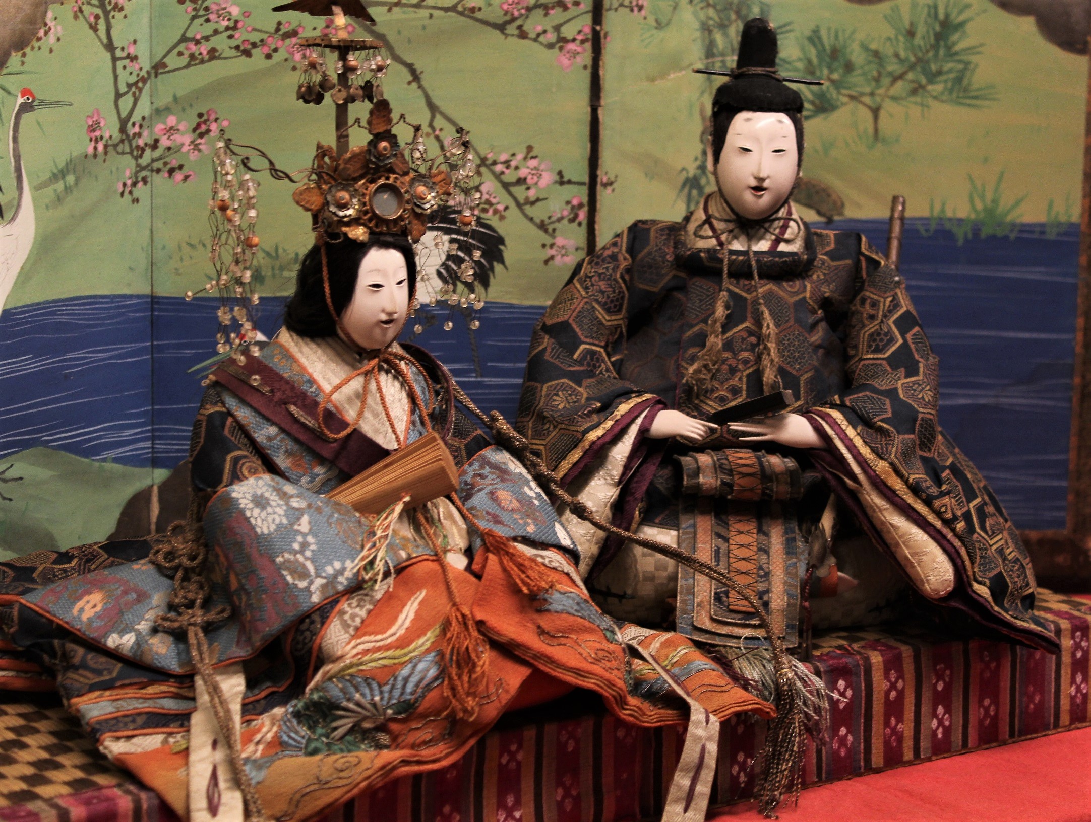 さて、まずは<まちの雛>。江戸時代、桃の節句に雛飾りを行う風習が定着すると、人形製作の技術が向上し、江戸・京(都)・大坂(阪)の大都市部を中心に、胡粉で美しく磨き上げた頭部、すが糸による結髪、金襴、緞子、繻子、縮緬などの美しい布裂を着せた「衣装雛」の数々が誕生します。それら衣装雛の様式には、元号の名を冠した「寛永雛」「元禄雛」「享保雛」、製作者の名を冠した「次郎左衛門雛」や貴族階級のみが飾った「有職雛」がありました。