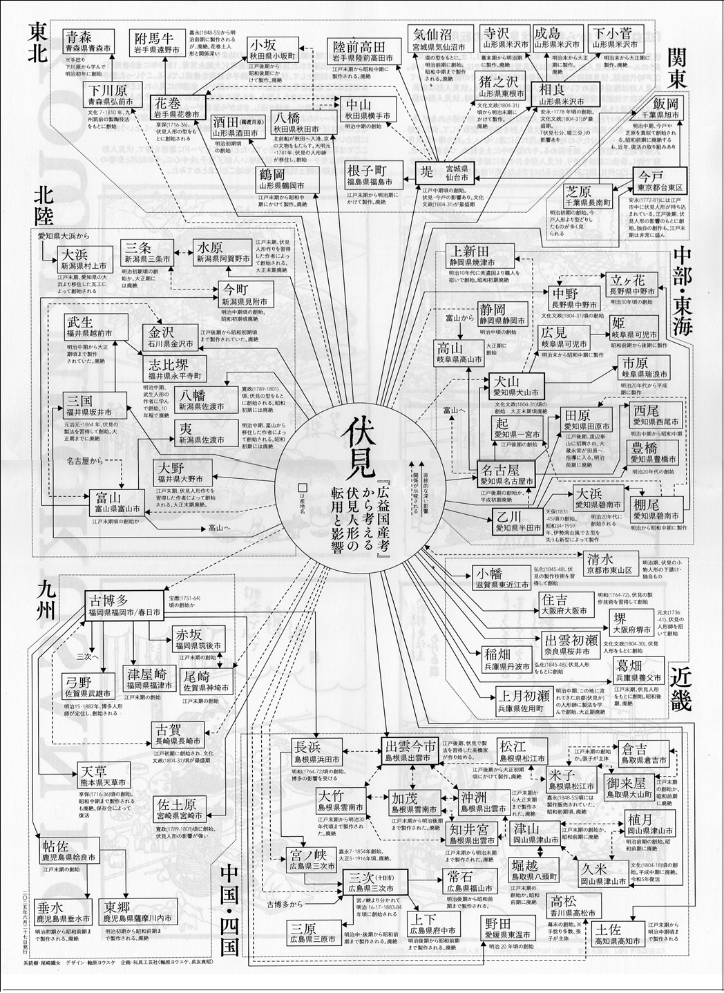 2025年、京都精華大学ギャラリーTerra-Sで開催された企画展「スケッチーズ~八瀬の石黒さん家から見た世界」に際して作成した郷土玩具の系統樹図❝『広益国産考』から考える伏見人形の転用と影響❞(企画:軸原ヨウスケ/作図・尾崎織女/デザイン・玩具工藝社:軸原ヨウスケ&長友真昭)