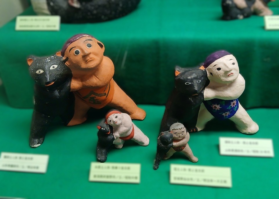 本年の展示でご紹介する武者や金太郎の土人形もまた、伏見を複製し、産地独自のアイディアを足し算して(あるいは引き算して)全国に展開した郷土人形の一分野です。さらに東北地方では、宮城県仙台の堤土人形が中心となって伏見の影響下に周辺の産地を育て、中部地方では名古屋や三河の土人形が、中国地方では出雲や長浜、松江の土人形が、九州地方では古博多土人形が中心となって、同じ生活文化圏への転用を促しました。模倣と創造の様子は、鎧をまとった大将と纏(まとい/馬印)をもつ従者、神功皇后と武内宿禰、太閤秀吉と加藤清正、牛若丸と弁慶などの組み物、また熊と金太郎、鯉と金太郎、松や竹と金太郎、米俵や釣鐘と金太郎など、動物や植物、器物を配した金太郎における造形の共通性のなかに確認することができます。一方で、産地それぞれに独自の味わいがあり、地域性や作者の個性もまたほほえましく感じられます。