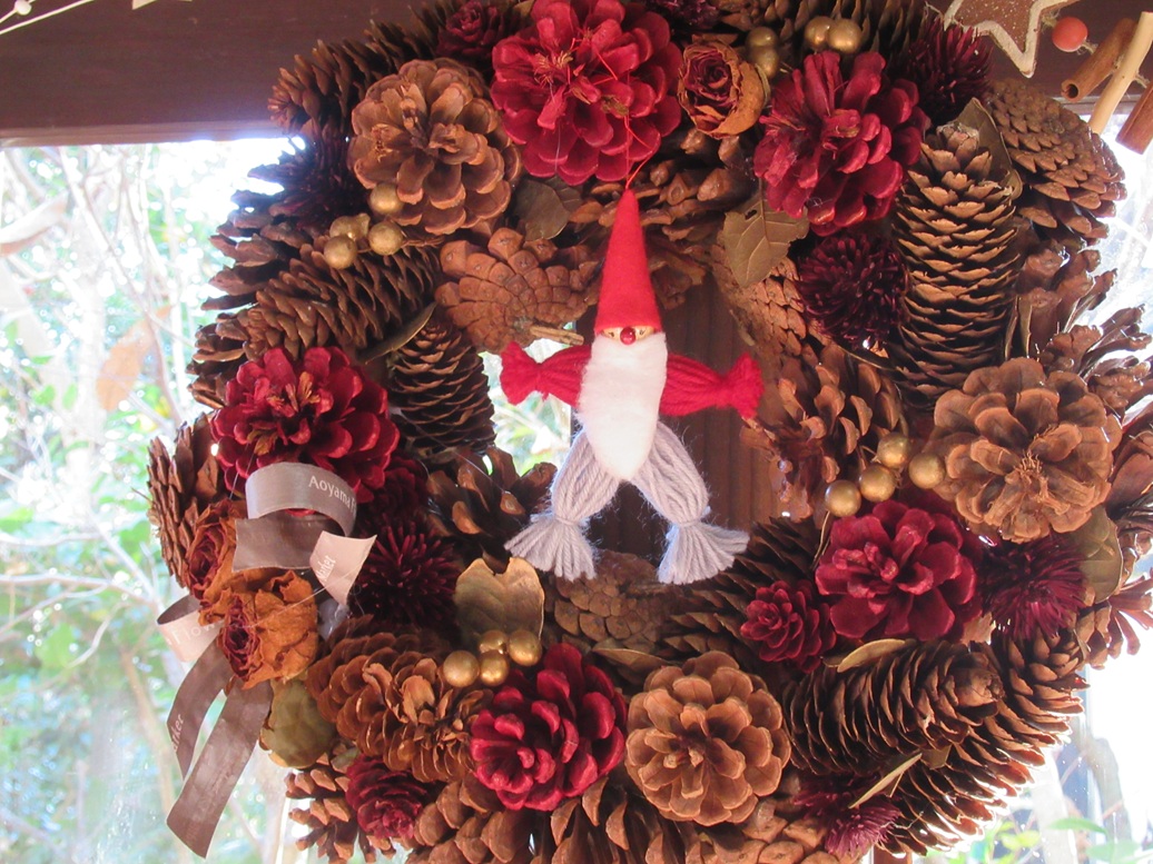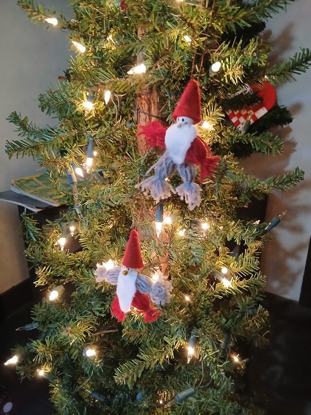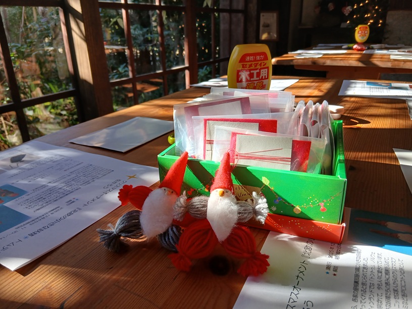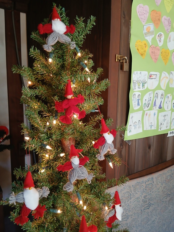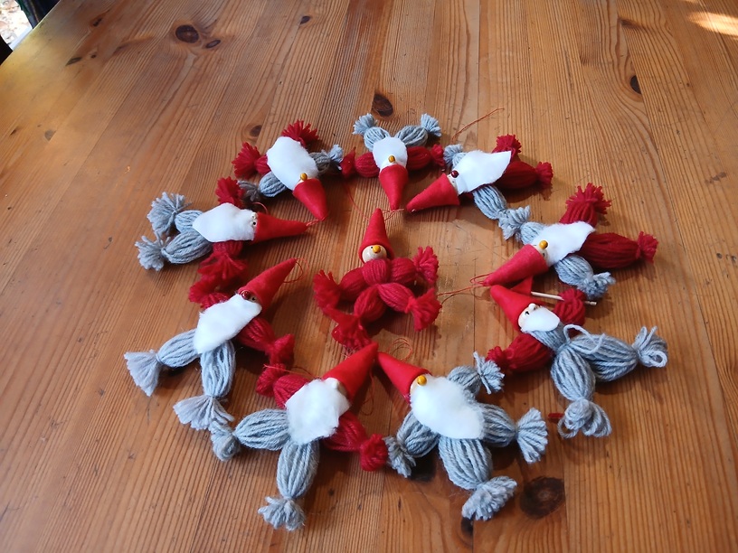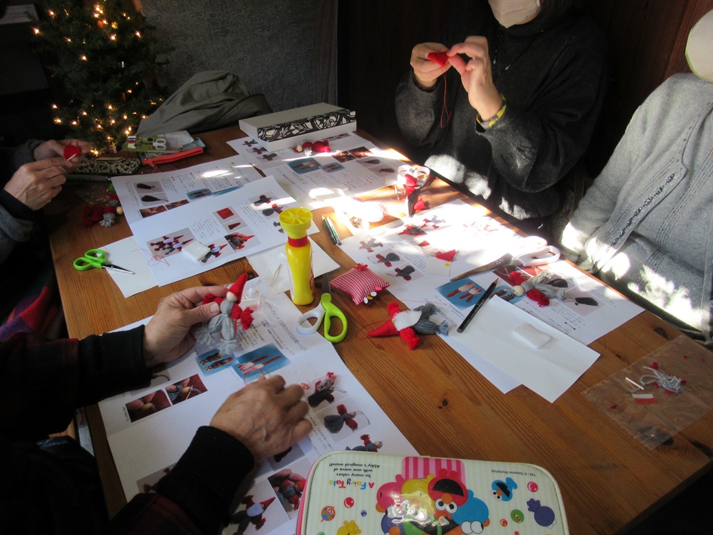 *朝はずいぶん冷え込みましたが、明るい光が差す一日。6号館前のテラスで、午前1回、午後2回、いずれの回も少人数で北欧の妖精づくりを楽しみました。スウェーデンのトムテやフィンランドのトントゥ、デンマークやノルウェーのニッセなど、北欧の国々に伝承される妖精たちのお話をしたあと、展示室でトムテたちを題材に作られた人形の姿を観察し、毛糸とウッドビーズを使って、ツリー飾りを作りました。ちょっとした表情の違いで作り手の個性が生まれ、どなたの作品も可愛らしい! 皆でツリーに飾りつけて楽しいひとときを過ごしました。その様子を画像でご紹介します。