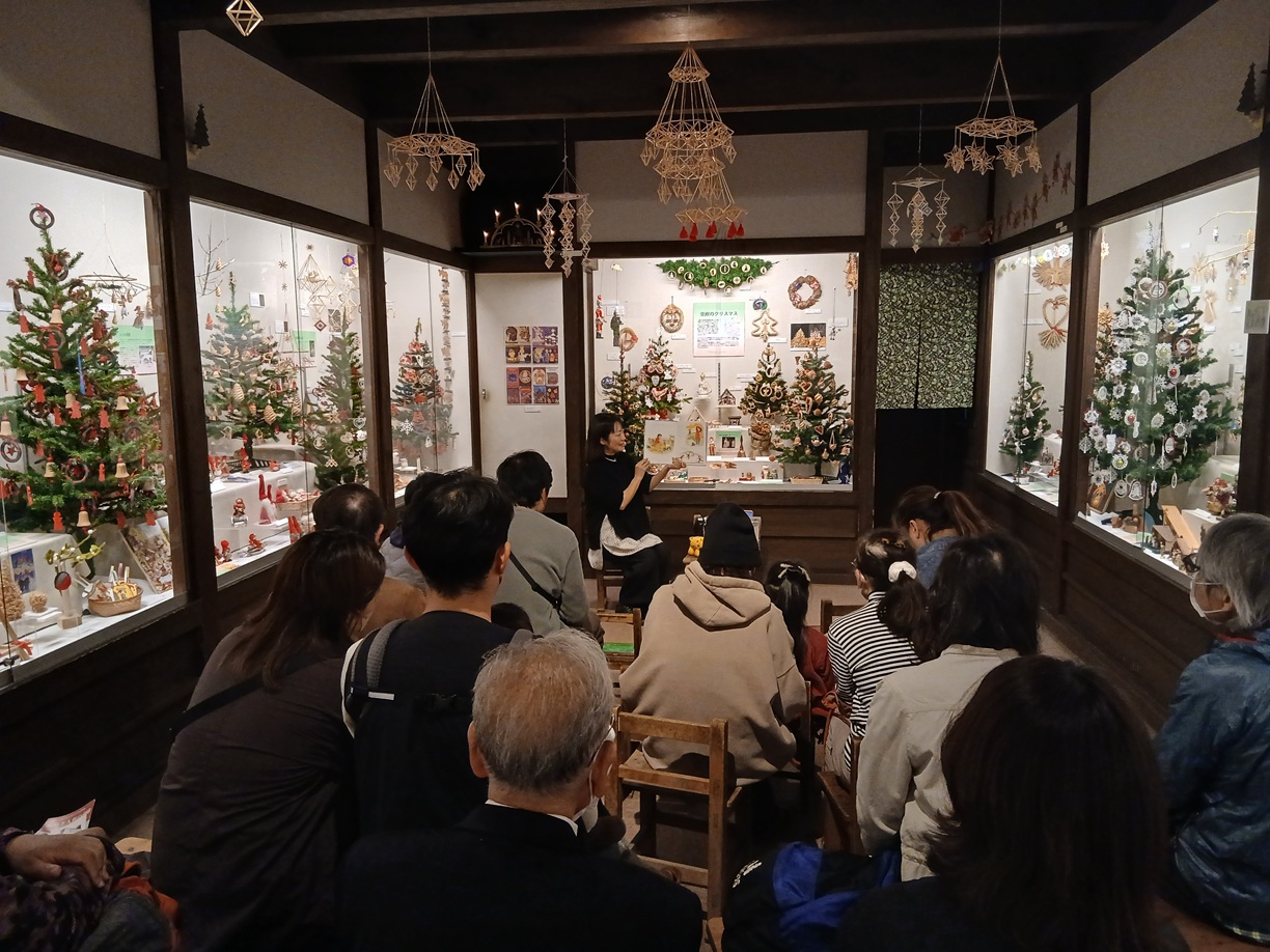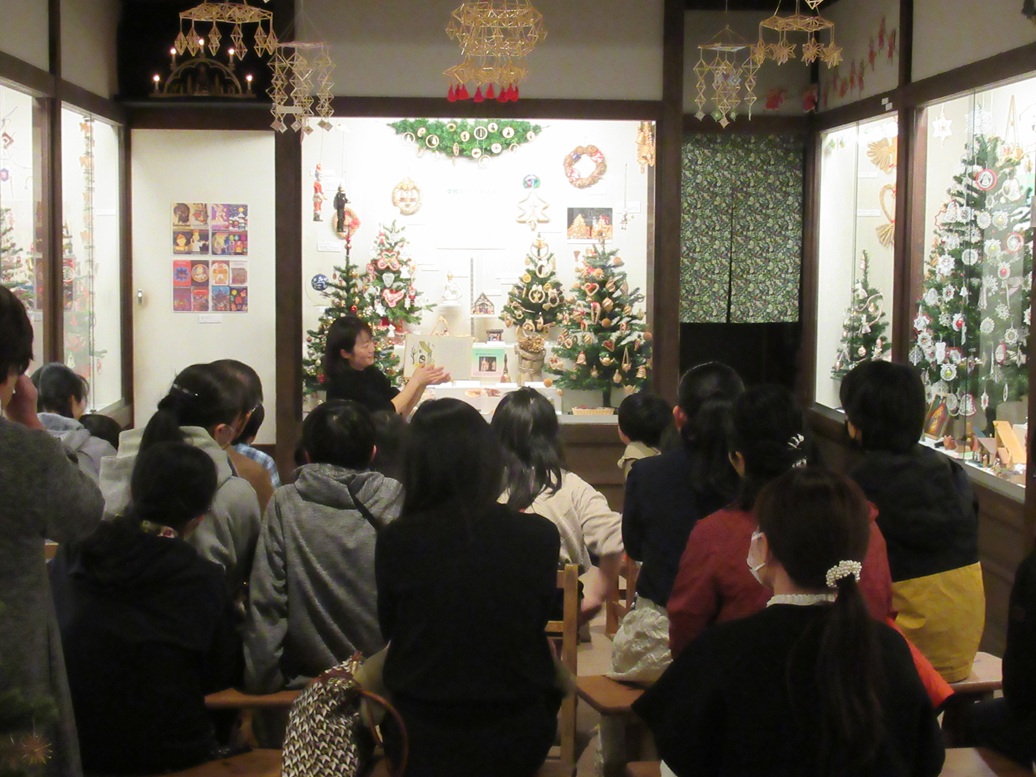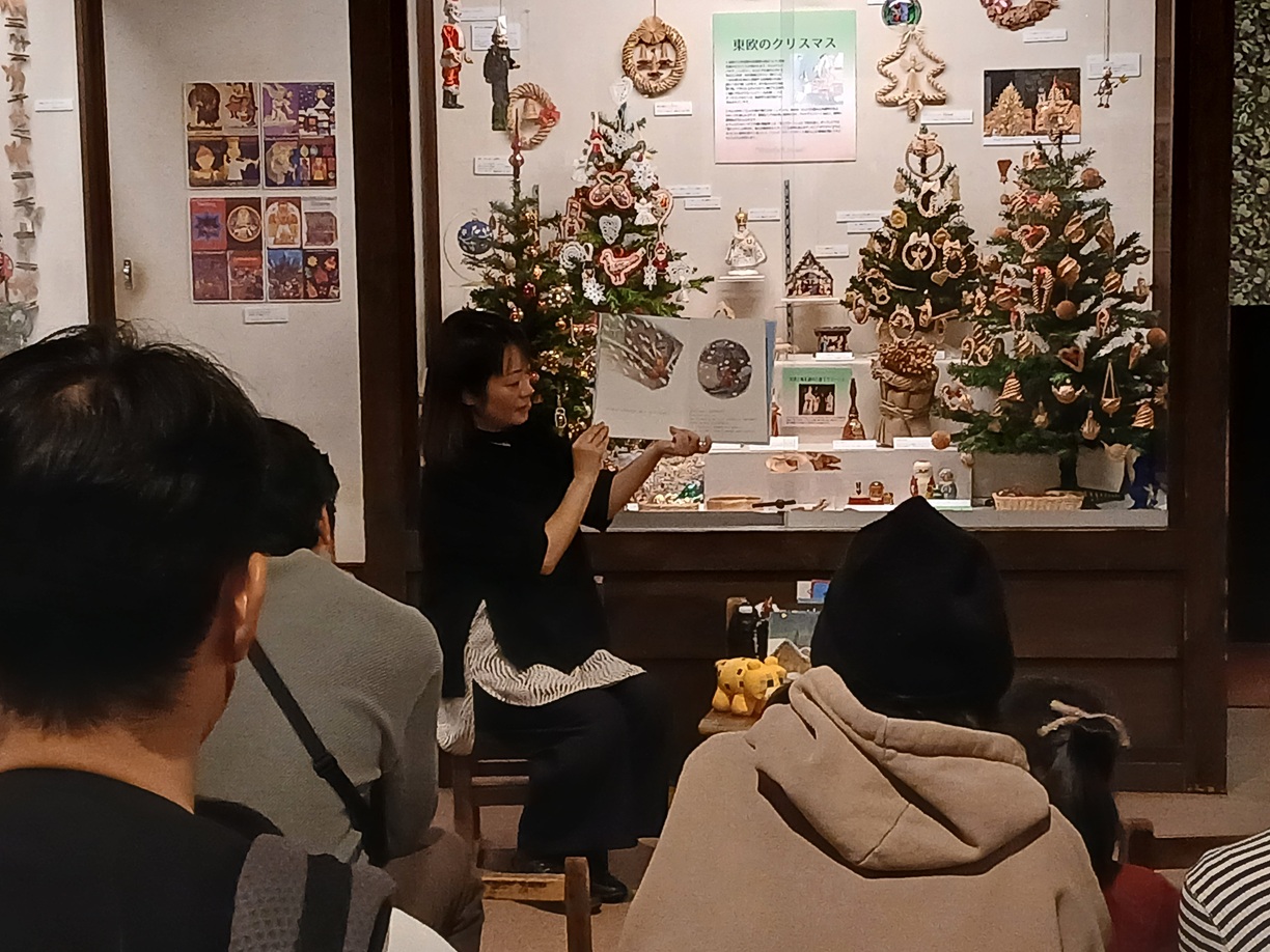 *冷たい雨が降る一日でしたが、展示室には倉主真奈さんのあたたかく澄んだ声がしみわたりました。麦わら細工のモビール「ヒンメリ」(フィンランド)や「プズリス」(ラトビア)、「ソダス」(リトアニア)が厳かな光をたたえる展示室で、小さな子どもからご年配の方々まで、やさしくも哲学的なクリスマスの物語に、みなで心を傾けるひととき。――それは、当館にとってステキなクリスマスの贈りものともなりました。