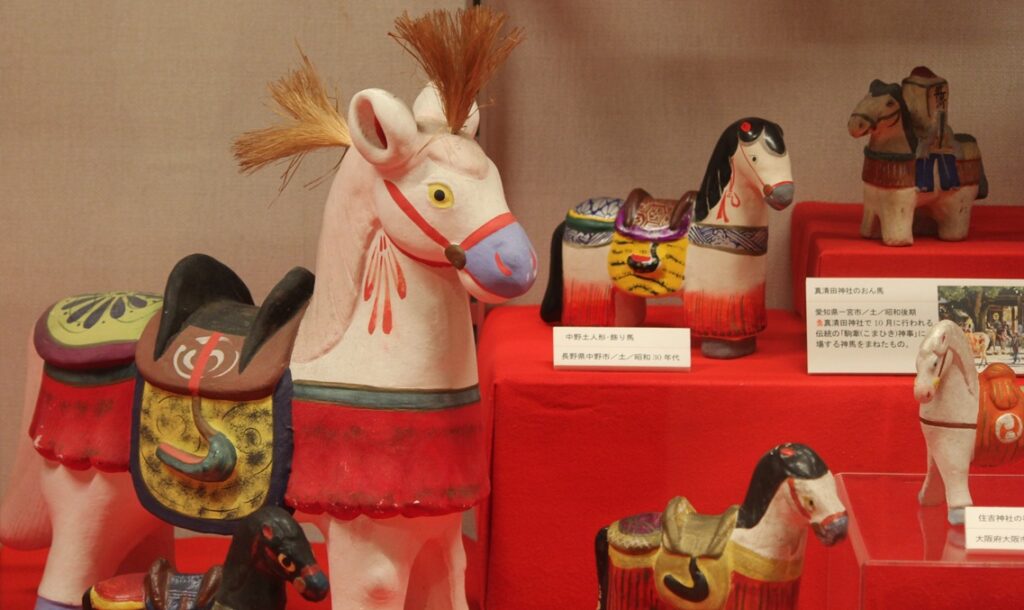 D.人と馬~馬とともに生きた人々~……馬の頑健さや賢明さから、人々は軍事、運輸、農業等に馬を用いてきました。馬に乗った武者や軍人への憧れから生まれた玩具、子どもが健康に育つよう願いを込めた馬乗り童子の人形、農作や運搬に用いた馬を表わした玩具など、人間とのつながりの深さを表現した造形の色々を展示します。