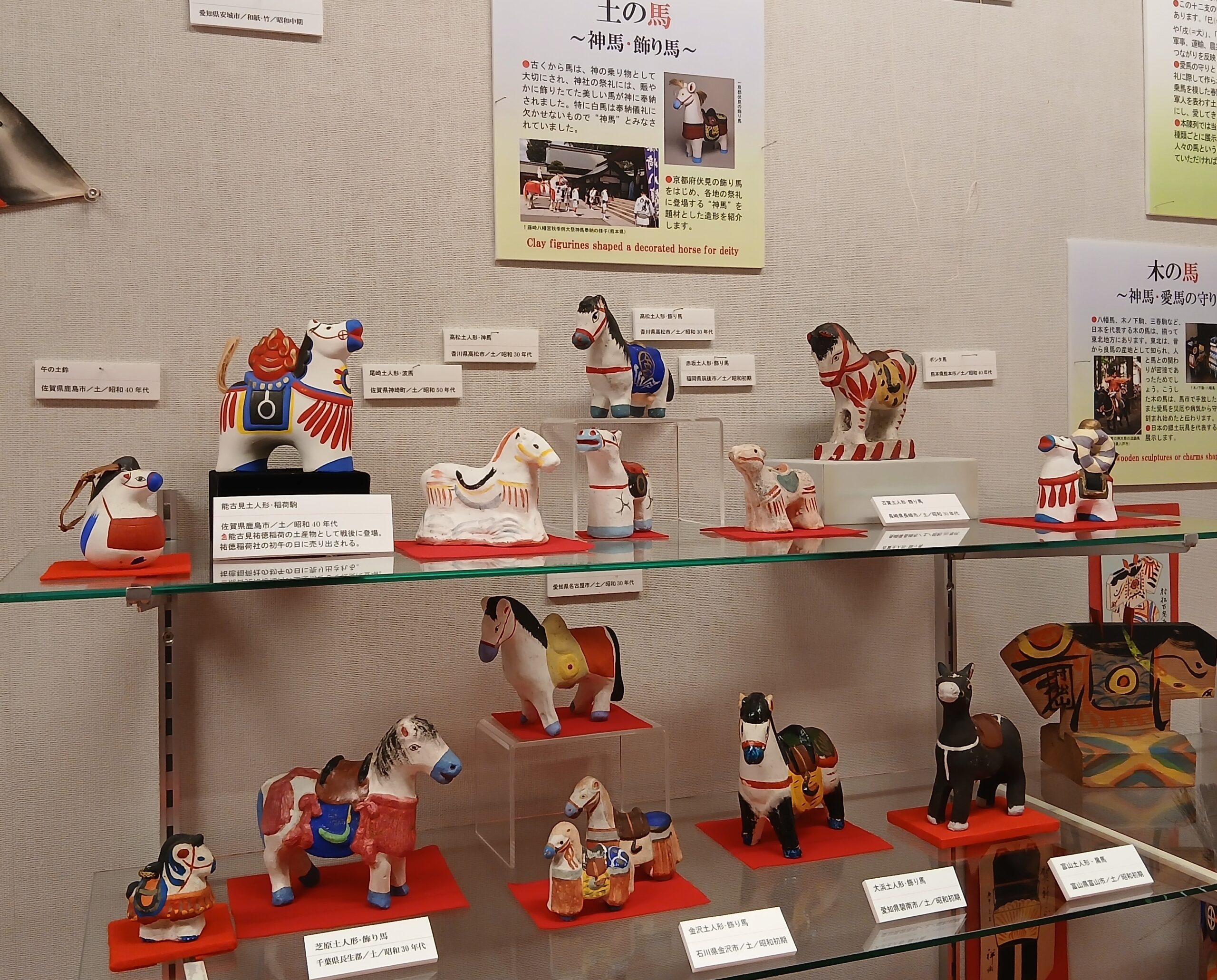 D.人と馬~馬とともに生きた人々~……馬の頑健さや賢明さから、人々は軍事、運輸、農業等に馬を用いてきました。馬に乗った武者や軍人への憧れから生まれた玩具、子どもが健康に育つよう願いを込めた馬乗り童子の人形、農作や運搬に用いた馬を表わした玩具など、人間とのつながりの深さを表現した造形の色々を展示します。