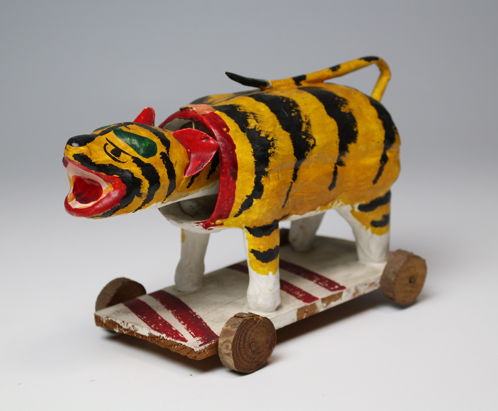 <張り子の虎> 端午の虎は邪気を払う霊獣として中国でも篤く信仰れている動物です。剛健で堂々とした虎の姿に、理想の男児像を託して、西日本を中心に、端午の虎飾りが流行しました。首ふり虎のほか、加藤清正の虎退治に因んだもの、『国性爺合戦』の和藤内と組み合わせたものなどが見られます。