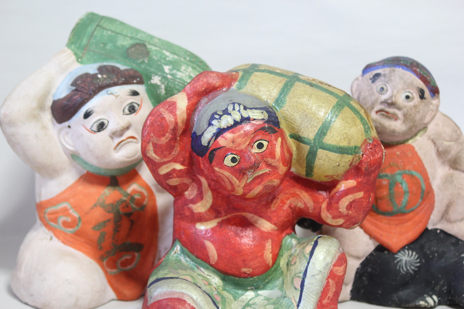 江戸時代後期、豪華な衣装をまとった武者人形や甲冑飾りが都市部の裕福な人々のものとして発展を遂げて行く一方、封建色の強い各地の農村部などでは身近にある安価な材料を用い、自給自足的に武者人形が作られました。土製のもの、反故の紙を利用した張り子製のもの、家具類製作時にでる木屑に糊を混ぜた練り物製のもの、また木製や裂製のものなど、土地土地に独特な着想で製作され、郷土の人々に歓迎されました。これらは、武者飾りが画一化する前の個性的な人形で、日本の人形史上に魅力を放っています。