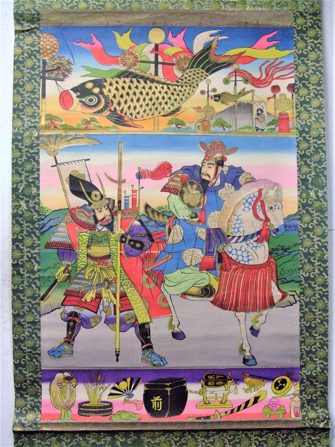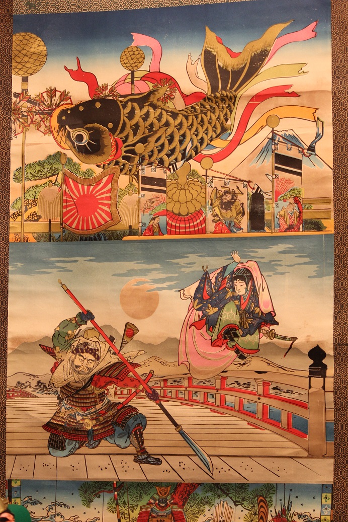 <端午の掛け軸飾り> 掛け軸に、節句飾りの様子や武者絵などが描かれた掛け軸は、場所もとらず、比較的安価であるため、明治末期から昭和初期にかけて盛んに飾られました。かつての端午の節句飾りの様子や、当時の風俗を物語る資料としても貴重です。