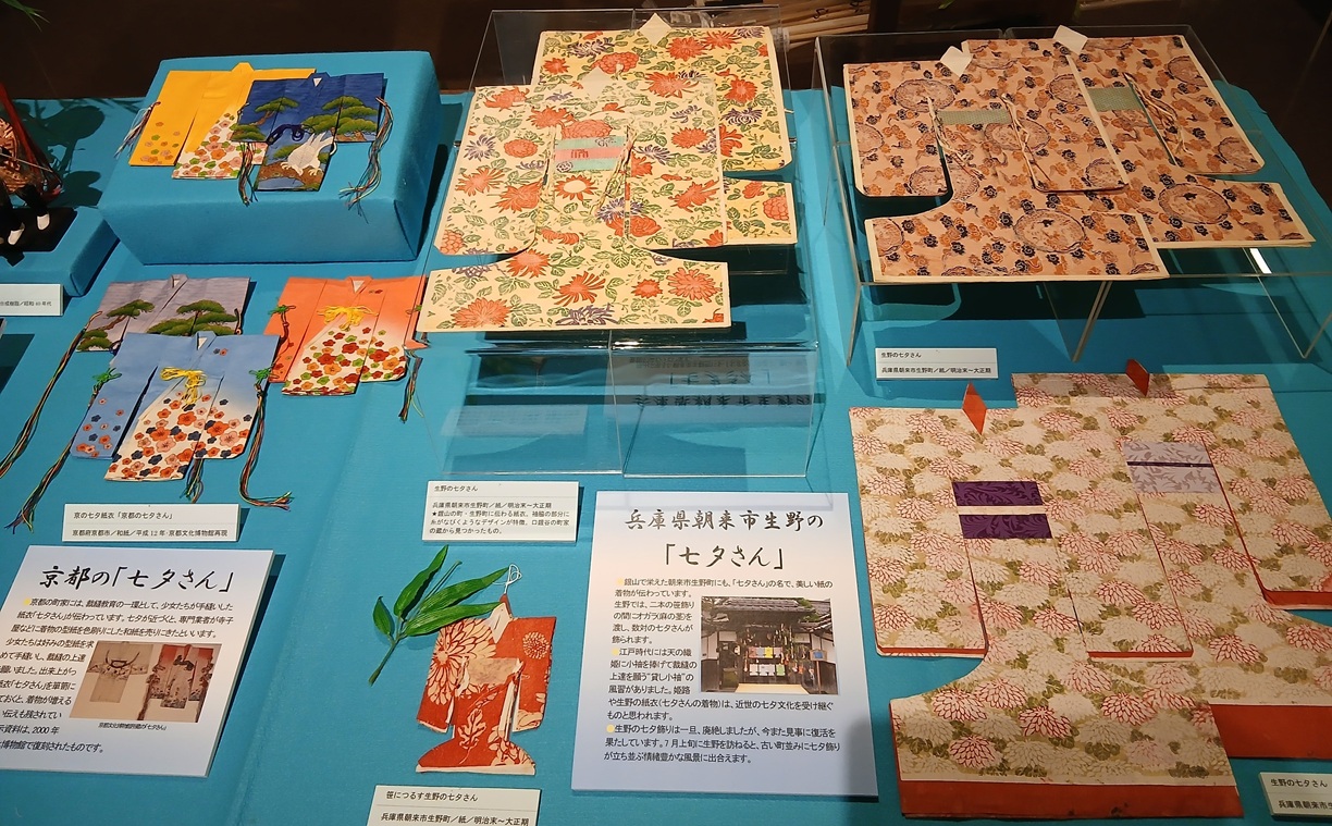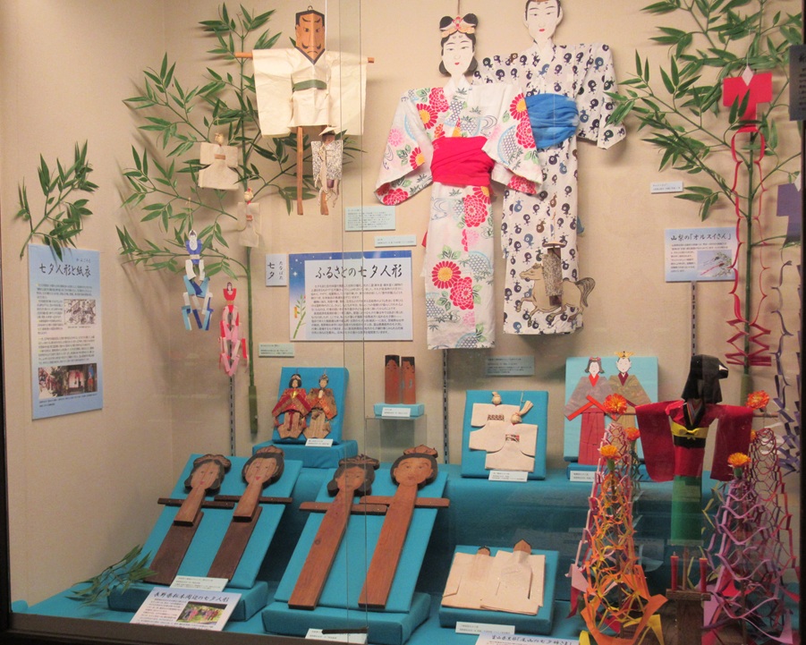 ●高度経済成長期を境に一気に廃れ、家庭における七夕行事は今ではあまり見られなくなりましたが、このコーナーでは、私たちが暮らす播磨地方に伝わる七夕飾り――塩田で栄えた播磨灘沿岸や銀山町・生野の七夕人形(紙衣)や宮城県仙台市の紙衣、長野県松本市に伝わる様々な形態の七夕人形、富山県黒部市の七夕流し行事に登場する七夕姉さま、さらに新潟県根知谷地方の七夕綱行事にみられる花嫁行列の人形などを展示し、日本の七夕の豊かな世界を垣間見ていきます。