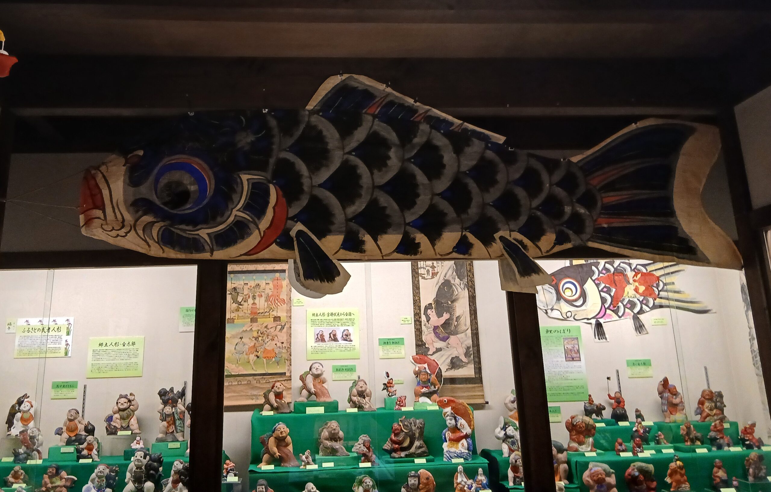●このコーナーでは、江戸時代末期から明治時代にかけて、大都市部の武者姿の衣装人形に影響を受けて、庶民の間に人気を博した人形飾り――土や紙など身近な素材を利用して量産され、かつての農村の五月を彩った金太郎、武者、力士、虎等をご紹介します。これらは、土地土地の独特な着想で製作され、武者飾りが画一化する前の個性的な人形で、日本の人形史上に魅力を放っています。加えて、戦前、庶民の間で人気を博した端午の掛け軸や鯉のぼりなどを合わせて明治・大正・昭和の素朴な節句飾りをしのびます。