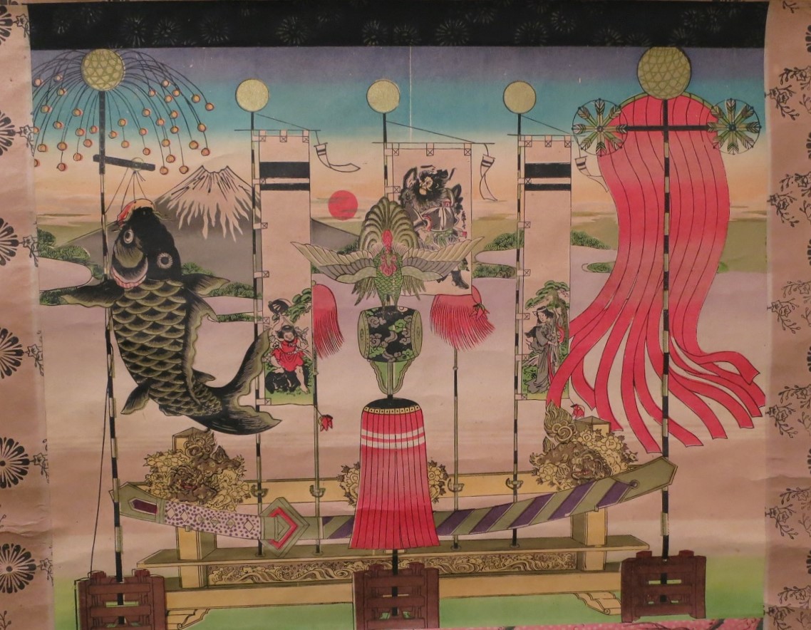 ●掛け軸飾り・・・掛け軸に、節句飾りの様子や武者絵などが描かれた掛け軸は、場所もとらず、比較的安価であるため、明治末期から昭和初期にかけて盛んに飾られました。かつての端午の節句飾りの様子や、当時の風俗を物語る資料としても貴重です。