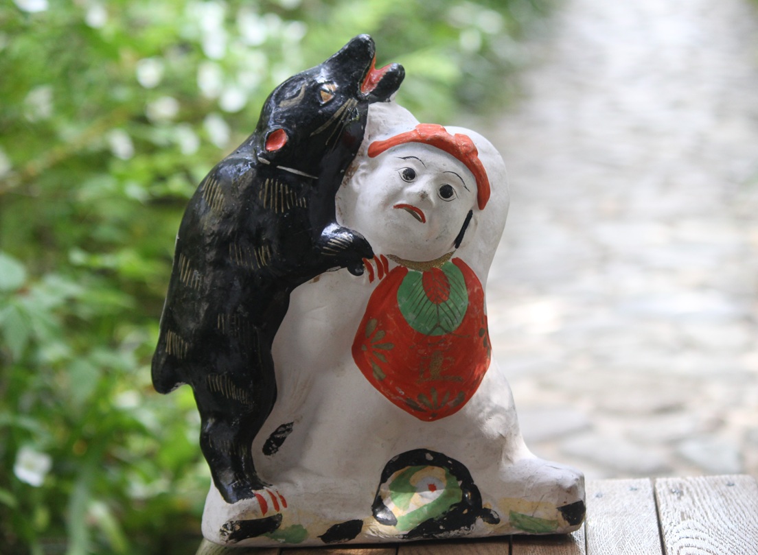 ●金太郎・・・金太郎は相模の足柄山で山姥の子として生まれ、のちに源氏の武将、源頼光の四天王となった坂田金時の幼名。熊、鹿、猿などと相撲を好む金太郎は、全身が赤く、剛健な子どもの象徴として親しまれてきました。江戸時代末期になると、この土人形が全国各地で愛され、明治時代には、端午の節句人形の代表となりました。力強さの表現には子どもが丈夫に育つようにとの願いが、金太郎の全身が赤い表現には、疱瘡よけや悪病払いのまじないとしての意味が込められています