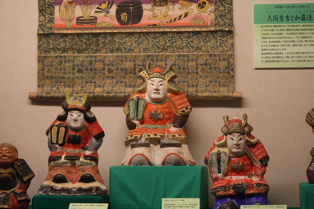●武者人形・・・神功皇后と武内宿禰、楠木正成、牛若丸と弁慶、太閤秀吉と加藤清正、和藤内など、和漢の歴史物語、芝居などに登場する英雄、豪傑などを人形化したもの。江戸初期には、飾り兜を他の武具類や幟とともに屋外に飾る風習がありましたが、この飾り兜が武者人形誕生の母体となりました。武者の土人形は、江戸末期から明治・大正・昭和初期を通じて、全国各地で人気を博しました。