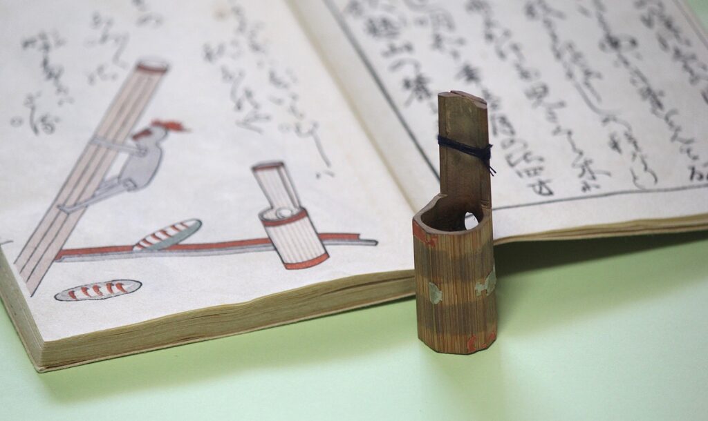 ●江戸時代初期には、手飼いの鳥の声慣らしのため、また鳥寄せや芝居の擬音づくりにも使用されていたようですが、時代が下ると、子どもたちの手遊び笛としても全国に普及していきました。江戸時代後期、安永2(1773)年刊行の玩具絵本『江都二色』には、最初のページにうぐいす笛が描かれており、江戸市中で流行していたことがわかります(手桶のような形をした玩具がうぐいす笛です)。