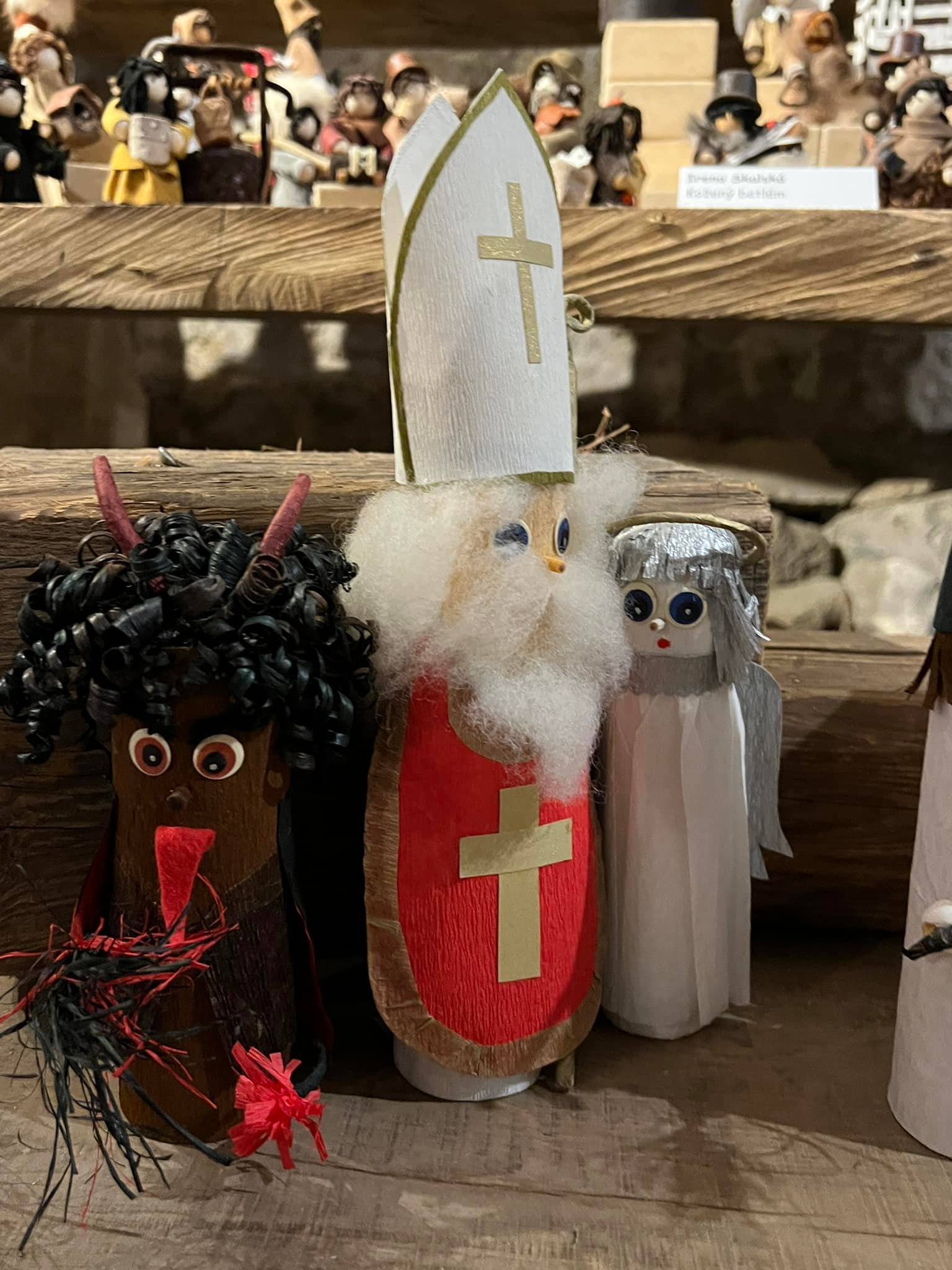 ●こちらはチェコのモラヴィア地方で作られた鬼・チェルトとスロバキアのブラチスラバ郊外で作られた聖ミクラーシュの人形です。どちらもきびがら(トウモロコシの皮)を糸で縛ったり、裂いたりして細工したもので、鬼は左右の手にお仕置き用の小枝とムチを持ち、2本の角を生やしていますが、おっとりとして愛らしい表情です。キリスト教の聖人が連れてくる鬼とはいったい何者なのでしょうか。なまはげのように、キリスト教普及以前、年の変わり目ごとに訪れていた土着の神さまだったのでしょうか。