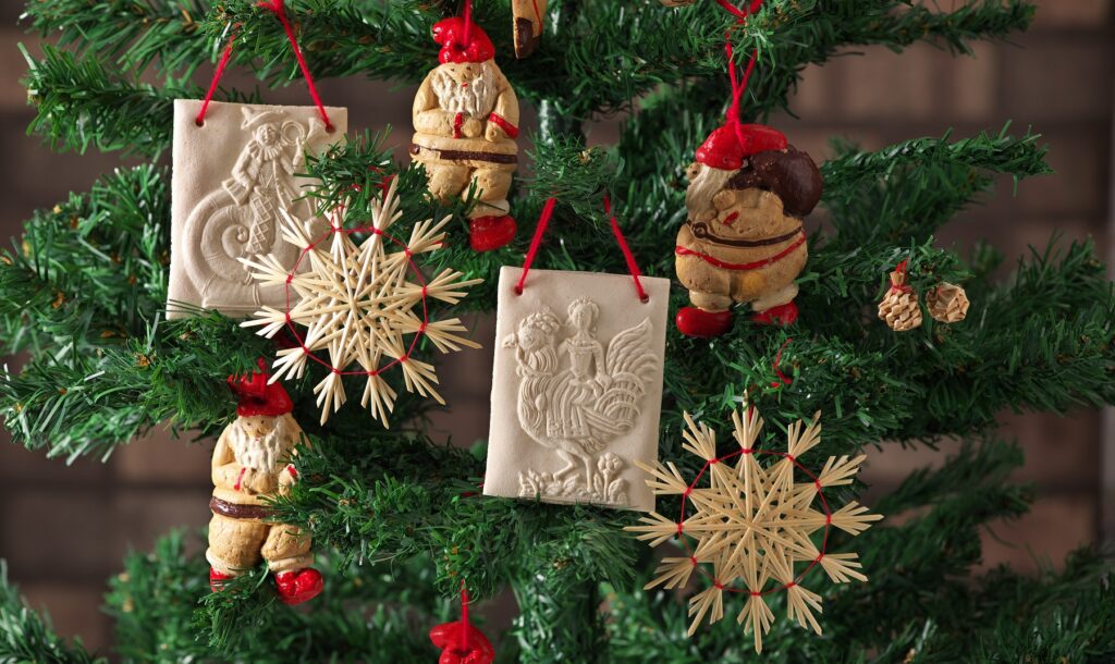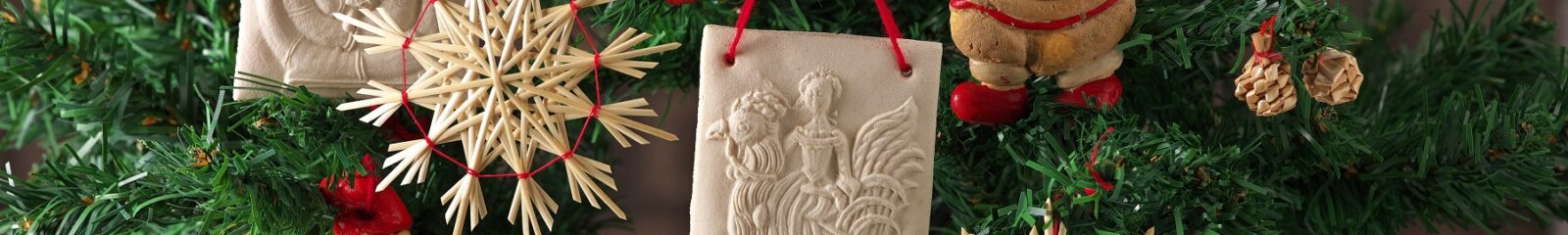 今年の「世界のクリスマス」展のドイツのコーナーには、クッキーと素焼きのオーナメントの2種類を吊るしたツリーを展示しています。小麦粉とスパイスで作られたテディベアと聖ニコラウスは、1980年代に作られた本物のクッキーです。古くからヨーロッパでは、冬の保存食にスパイスの効果はかかせないものですが、加えて暗く寒いこの時期にやってくる魔物を撃退する魔除けの香りとしても親しまれてきました。現在でもジンジャークッキーやシュトレンなどのクリスマスのお菓子に受け継がれています。