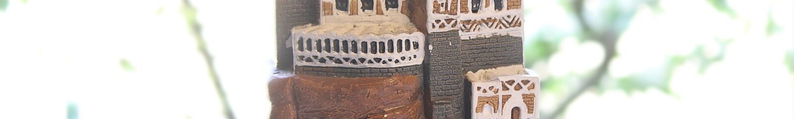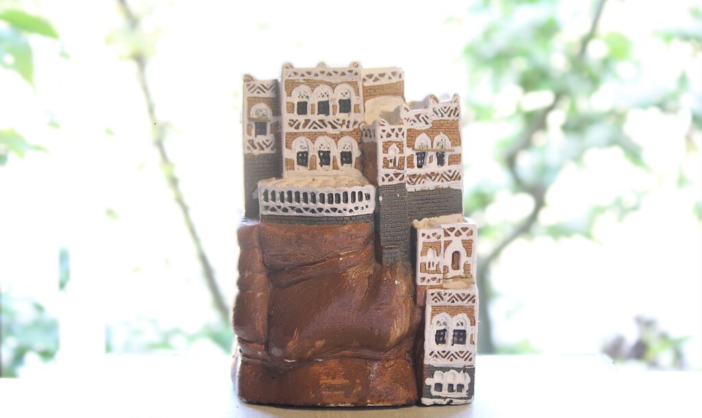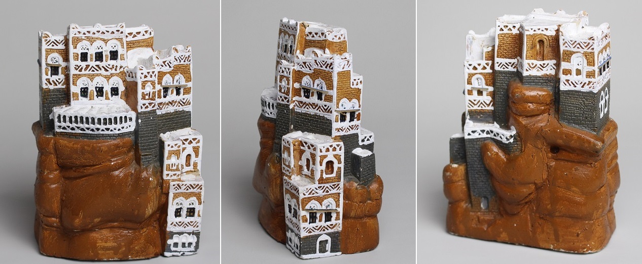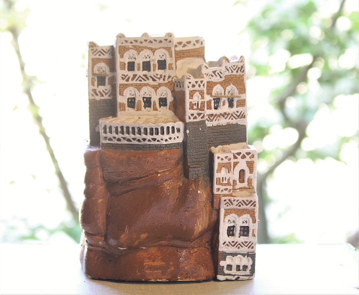 ●数年前、かつてアラビア半島南部の海沿いの国、イエメンを旅された方から、「日本玩具博物館の展示背景に役立ててください」と首都・サナアのシンボル「ダール=アル=ハジャール(岩の宮殿)」を模した陶製の造形物をいただきました。