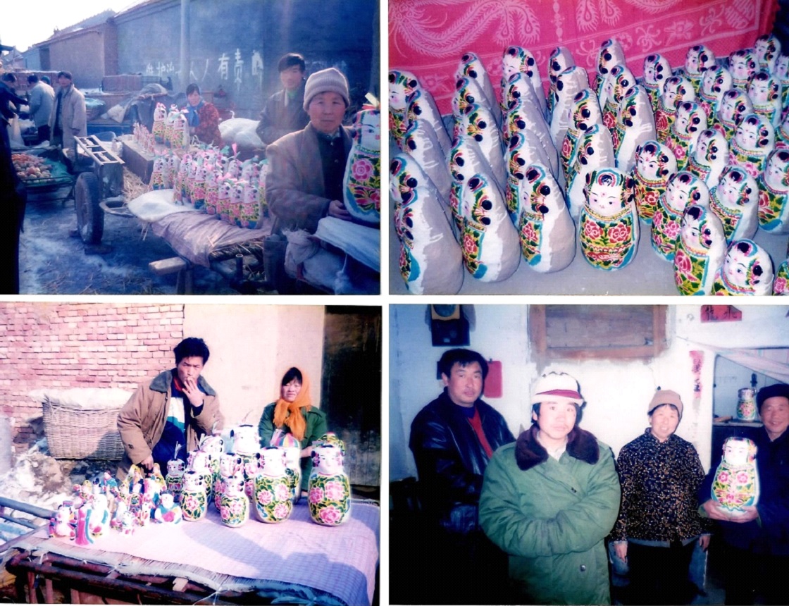 ●山東省浜州市の西北部、恵民県に伝わる「不倒娃娃」は、中国民間玩具の研究者、李寸松氏(1927~2011)から寄贈を受けた品で、1997年の早春、恵民県火把李村の❝太陰暦二月二日の廟会❞で売られる不倒娃娃を求めて、同氏が製作者が住む河南張村を訪問された折、当館のために収集してくださった品です。旧暦2月1日の河南張村では、翌日、廟会の市場で販売するために、どの家にもたくさんの不倒娃娃が並べられていたといいます。李氏の調査によれば、かつては村をあげて多くの種類の人形が作られていたのが、訪問した当時は、十軒ほどが廟会のための不倒娃娃作りに取り組むのみになっていたということでした。下記の写真は、その4年後、日本郷土玩具の会の柊澤玄樹氏が同地を訪ねられた折のものです。