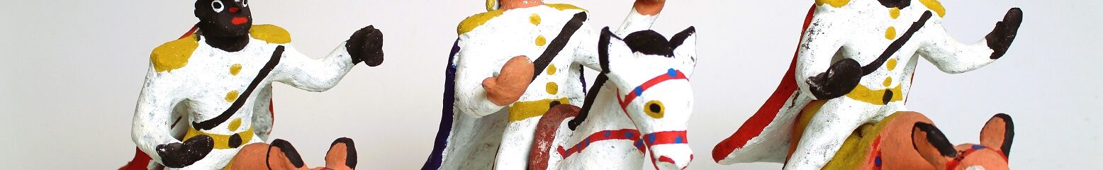 カショエラ村の三人の博士は、高さ約20㎝。ラクダや馬にのってベツレヘムを目指す姿で表現されています。バイヤ州では、公現節の日、三人の博士からプレゼントをもらう習慣もあり、カスパール、メルキオール、バルタザールは子どもたちから敬愛を受けています。 11月3日から6号館で開催する「世界のクリスマス展」でご紹介しています。
