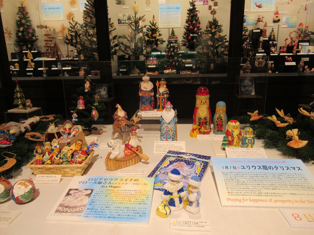 ●本年は二つの章立てで展示構成しています。第一章【クリスマスの暦をたどって】では、「11月30日*待降節がはじまる」「12月6日*聖ニコラウスの訪問」「冬至*太陽の復活を願う冬至」「クリスマスイブ*クリスマスツリーの完成」「クリスマス*贈り物配達人の訪問」「クリスマス*キリストの降誕」「降誕祭から1月6日*公現節へ」「1月7日*ユリウス暦のクリスマス」の8つの項目でクリスマスのもつ幅広い世界を紹介しています。