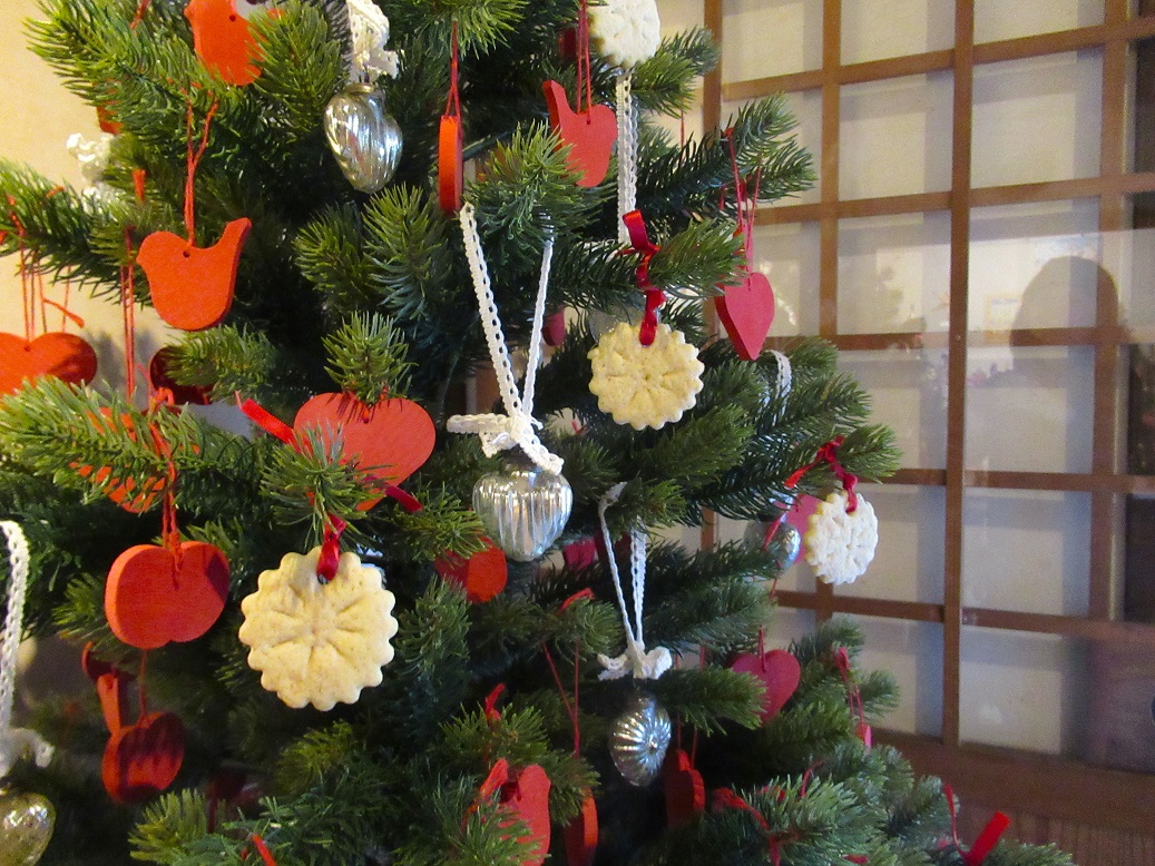 🎄今年も玩具博クリスマス展会場入り口の赤い木のオーナメント(フィンランド・アーリッカ社製)や硝子製ハート形のオーナメント(デンマークデザイン)をつるしたモミの木に、太陽模様(車輪のスポーク文様)の円形クッキーを焼いてプラスしました。16世紀から17世紀、アルザス地方やドイツの町々でクリスマスに飾られはじめたモミの木には、りんごなどの木の実や薄い焼き菓子などがつるし飾られていました。始まりのころのクリスマスツリーに想いをはせて展示しています。ご来館の折には近くでご覧ください。