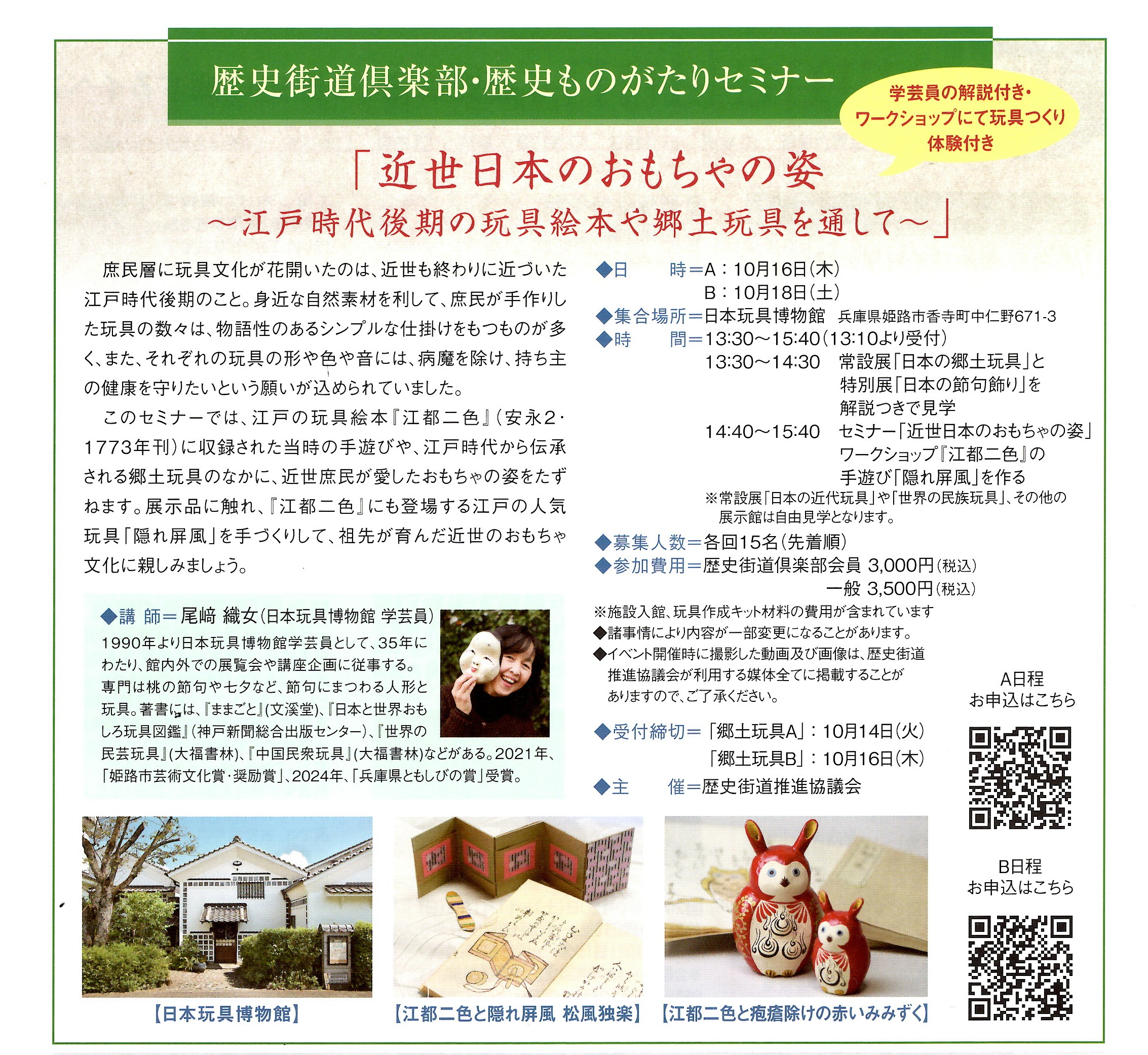 ●来る10月16日(木)と18日(土)の各日、13時30分から、歴史街道推進協議会主催の「歴史ものがたりセミナー」が当館で開催されます。「近世日本のおもちゃの姿」をテーマに学芸員の展示解説とお話、ワークショップなどを詰め込んで、たっぷりと玩具博を楽しんでいただこうというものです。まだ締め切られていませんので、よろしければ、ご参加ください。お申し込みは、QRコードからお願いいたします。