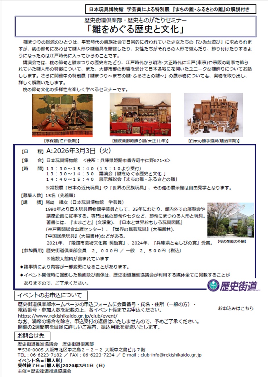 *3月3日、歴史街道推進協議会主催「歴史ものがたりセミナー」❝雛をめぐる歴史と文化❞が当館で開催されます